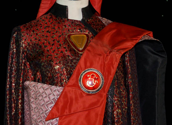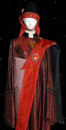 Description: The Vulcans are a humanoid race from the plant Vulcan who are known for their great sense of logic and stoic nature. They were one of the instrumental species responsible for establishing the United Federation of Planets. This impressive Vulcan robe costume was made for wear during the Star Trek feature films. It includes a beautiful red, black and gold robe with black trim and bell sleeves. An inverted triangular resin embellishment is on the chest with Vulcan iconography painted in gold in the center. Worn over the robe is a patterned sash with rust color trim and a circular resin embellishment at the top. Also included is a black shaped felt hat with a padded section at the back, rust colored band and chin strap and a resin Vulcan embellishment on the front.