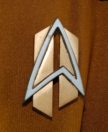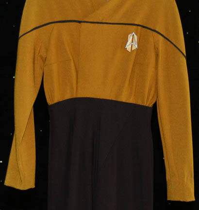 Description: An impressive futuristic Operations Gold Starfleet jumpsuit with black trim around the shoulders. There is a zip up the back, an adjustable internal waistband and a small Velcro patch on the left side of the chest for a combadge to attach. The accompanying combadge is in the alternate timeline style and made of resin painted gold and silver. This style of costume was featured in episodes that involved alternate timelines such as Star Trek: Voyager, “Endgame”. Costume comes complete with costume tag.