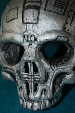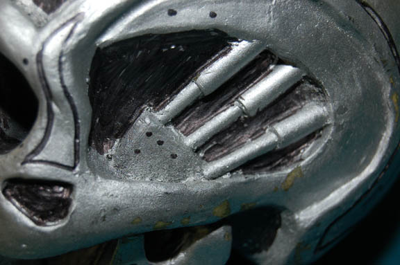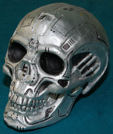 Description: A lot of Borg skeletal remains featured as set dressing in various Star Trek series and movies. This lot consists of a acrylic cast skull, painted silver featuring textured black detail dividing the skull into compartments with “screw” holes securing them; a similar skull minus its jaw and half of the back of the skull but resin cast instead of acrylic, and a matching spinal column featuring numerous wires, jacketed and bare, jetting out from between the vertebrate and a rigid cord with a threaded umbilicus. Measurements are as follows; the full skull measures approx. 8 X 7 X 6, the smaller one 8 X 5 X 5, and the spine measures approx. 18 X 7 X 4 inches.