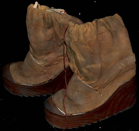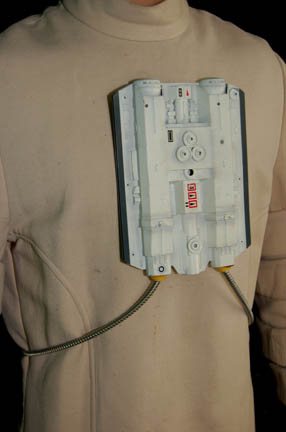 Description: A costume appearing in various Star Trek feature films like Star Trek I: The Motion Picture, Star Trek II: The Wrath of Khan, and Star Trek III: The Search for Spock. The costume is a full length jumpsuit colored beige with thick lines of padding around the sleeves and legs. The jumpsuit features placements for accompanying vacuum formed gear that is molded with details suggesting hardware, connected to one another with metal wrapped cables, one of which is broken loose from the front piece position on the right side, but can easily be placed back within its housing. The costume comes with boots that were not located with the lot, but fit its overall appearance despite their being distressed to appear ‘dirty'.