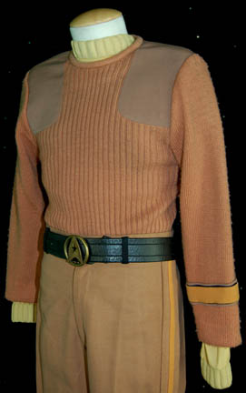 Description: A caramel colored field duty uniform featured in Star Trek V: The Final Frontier for wear by George Takei in his portrayal of “Sulu”. The costume is caramel colored wool trousers with yellow operations division stripes down the outside seams and a matching wool sweater with a yellow division strip on the left sleeve, with a yellow long sleeved uniform undershirt that features a ribbed collar and cuffs. The costume also comes with a black leather belt with a gold colored metal Starfleet emblem buckle for an officer measuring 32-34 inch size and a gold and silver colored metal rank badge with one wire back indicating the wearer to be a ‘commander'. The sweater features a sewn in Paramount tag reading ‘Takei’, the shirt was located separately from the rest of the costume as was the belt. The costume comes with uniform specific Reebok brand name boots colored tan and black with multiple black plastic zip tightenings, size 11, with visible wear due to age. This lot represents the last remaining costume of this style for this character, “Sulu”.