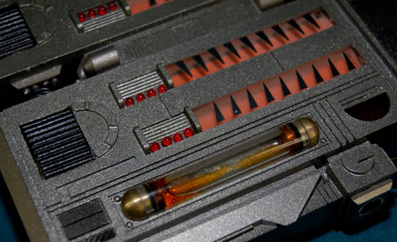 Description: A prop device featured in the Star Trek: Enterprise episode “Vanishing Point”; wherein “Ensign Sato” has her first transporter experience and thinks that something is happening to her molecules because of it. This item is part of a series of explosive devices that “Ensign Sato” imagined she saw aliens hooking up to vital systems on the “Enterprise NX-01”; it is a roughly rectangular device, resin cast in a pewter shade, bisected into two identical segments each with a black box at the top, twin clear segments featuring a red background and black triangular accents, two sets of four red , non-working, LEDs, a tube with an orange colored fluid, a prop “dial” on the other end, faux “circuitry” with wires leading out of it and both pieces screwed together and tied with wire on the bottom. Item has untested electronics and measures approx. 6 X 6.5 X 2 inches.