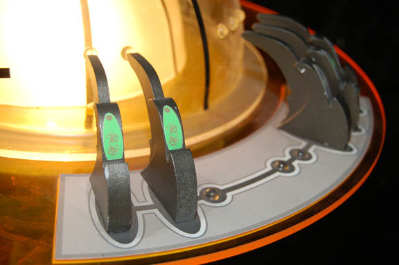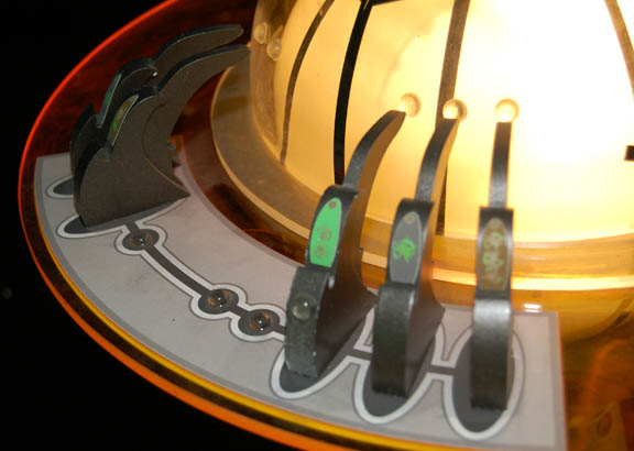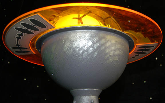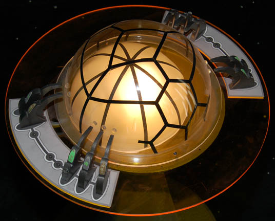 Description: A piece of set dressing featured in the Star Trek: Enterprise episode “The Hatchery”: wherein the “Enterprise NX-01” finds an abandoned Xindi-Insectoid ship with a hatchery of unhatched eggs that “Captain Archer” (Scott Bakula) becomes bewilderingly attached to. This is one of the access terminals on the extremely decentralized Xindi-Insectoid ship and consists of a large, circular, mauve-colored base featuring an upside-down cone-shaped shaft leading to a sphere that is bisected by a flat, circular piece of yellow plastic with graphical applications of Xindi technology, dark-gray, claw-like controls. The clear plastic, upper half of the globe featuring black detail lines dividing the hemisphere into different geometric shapes, two screws that attach it to the bottom half, an opaque, white plastic hemisphere under the clear one that is divided into either even sections with the same black detailing as the first. Inside the second half-sphere is a cylinder of the same plastic, perforated, that an energy-saver light bulb fits into and shines out of when the plug protruding from the base is plugged in. The item measures approx. 40 inches in height and 20 inches in diameter at its widest point.