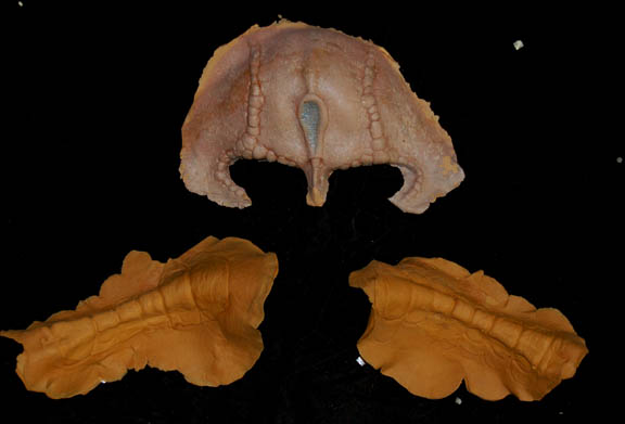 Description: A costume similar to those featured throughout Star Trek: Deep Space Nine for wear by members of Cardassian Military. This costume consists of two long-sleeved, full-size dark-blue jumpsuits featuring heavy pleating along the arms and legs, buttons and clasps around the chest area, and stirrups for the feet. A black, molded-rubber, armor piece of the Cardassian style, a Velcro’d division strip on the right side, a larger diamond pattern along the chest, the same irregular, striping on the arms and ribs, converging to a point at the waist, green plastic arm and rib armor and matching molded rubber, knee-high boots. Sewn in tags denote use by multiple actors but the arm and rib armor are labeled specifically as being “Marc Alaimo”. Also included are a latex Cardassian forehead” appliance with the trademark “tear drop” formation and the bony crests that come down and encircle the eyes, and matching a pair of the appliances used on the shoulders.