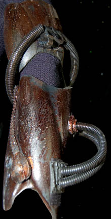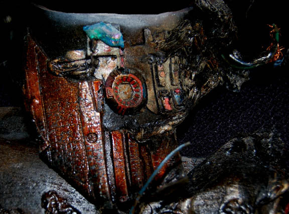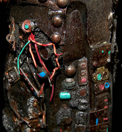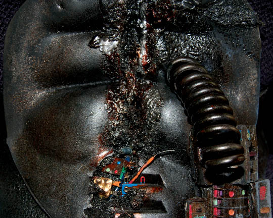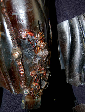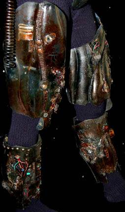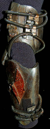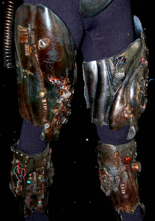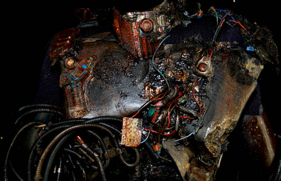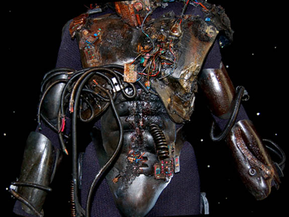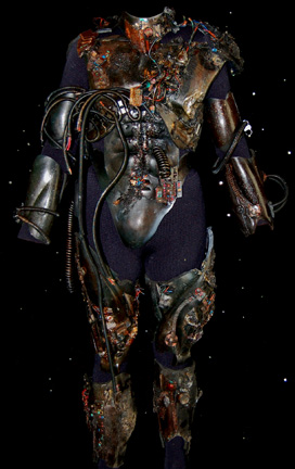 Description: The Borg are an eclectic race of cyborgs with a single goal – perfection. There are no individuals, only members comprised of many species that were assimilated into the collective. They are considered to be the most threatening force in the galaxy. They were featured throughout the Star Trek anthology however this style of Borg was featured in the Star Trek: The Next Generation series in episodes such as “I, Borg” and “Descent, Parts I & II”. The costume includes a black waffle knit jumpsuit with built in feet and a zip up the back and between the thighs. Worn over the jumpsuit are distressed latex rubber, resin and tube attachments that fasten onto the body with Velcro. There is a lower abdominal section, a breast and back plate that is designed to be one piece however due to time and use it is broken into two pieces that need to be reattached to each other for it to stay on the body. Separate biceps and forearm attachments that all fasten with Velcro. The thigh and calve pieces fasten with Velcro in the back. All of the attachments are incredibly detailed with wires, paint, textured surfaces etc… Due to time the glue holding the Velcro strips in place on the limb components has, in some cases, lost its adhesiveness and needs to be re-glued. The actual rubber elements however maintain their integrity.