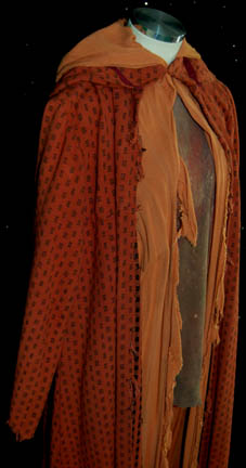 Description: A female Vulcan costume featured in the Star Trek: Enterprise episodes “Awakening” and “Kir’Shara”. The costume is a mock turtleneck tie died to appear as worn, orange and gold streaked trousers, faded to appear used, and a pumpkin colored robe with a thicker cotton woven robe with black rectangle pattern. The costume is torn and thrashed to appear worn and desert used. A sewn in Enterprise tag is present, and a costumer’s tag reading ‘Enterprise #083-084’ and listing the components.