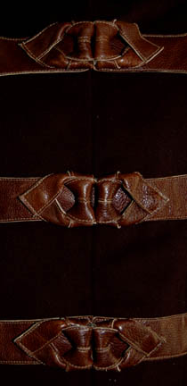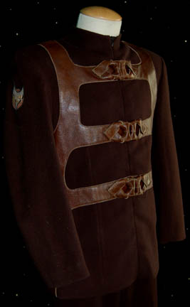 Description: The “Takret” are a humanoid species originally from the Takret System who were featured in the Star Trek: Enterprise episode “Catwalk”. This costume was made for wear by a Takret Officer who was a member of a boarding party that attempted to seize control of the Enterprise while the crew was sheltering from a neutronic storm. The costume has a brown wool jacket with brown leather straps and a zip up the front. On each sleeve are sewn on Takret patches. The accompanying trousers are brown wool. Costume comes complete with costume tag indicating wear by veteran Star Trek stuntman “Vince Deadrick”, most likely referring to Vince Deadrick, Jr.