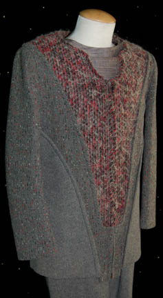 Description: The “Cardassians” are a humanoid species from the planet Cardassia Prime in the Alpha Quadrant. They were featured extensively in Star Trek: Deep Space Nine but also made numerous appearances in Star Trek: The Next Generation and Voyager. This male Cardassian costume was made for wear during the DS9 series and includes a gray coat with red, black and white flecks and a woolen chest section. Worn underneath is a gray and black shirt with a zip up the back and gray woolen trousers. Costume comes complete with costume tag. Also included is a latex Cardassian forehead, nose and shoulder pieces made to create the Cardassian appearance on the show. Each piece is carefully painted to resemble Cardassian skin tone.