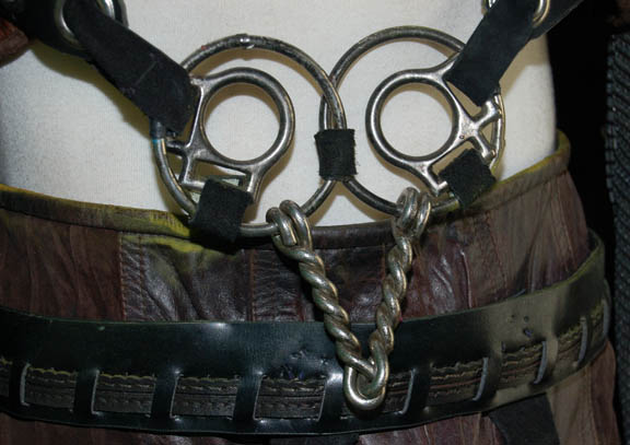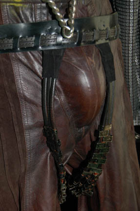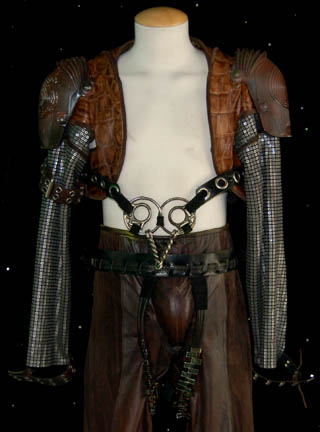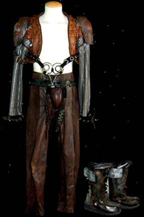 Description: A costume featured in the Star Trek: Enterprise episode “Borderland”; wherein the “Enterprise NX-01” needs the help of a convicted criminal, “Arik Soong” (Brent Spiner) to prevent a war with the Klingons being precipitated by the augmented humans from the Eugenics Wars. This costume is one of the Orion guards at the slave auction where “T’Pol” (Jolene Blalock) and several other crew members were to be sold; it consists of worn brown, leather trousers featuring darker-brown suede accents along the outsides of the legs, a built in codpiece and stirrups for the feet. A brown leather, half jacket in a faux reptile skin print, featuring “chainmail” sleeves, textured rubber shoulder armor, black, leather straps around the cuffs, an elaborate leather strap and metal ring accented harness that goes across the chest, and a black leather belt featuring braided, beaded, and intricate, textured metal accents. Included are a pair of leather, knee-high boots that have been mounted three-inch heels, several foam accents in the form of “bolts”, “spikes” and pieces of vinyl all meant to give the boots a more fearsome appearance. A sewn in tag reads ‘Enterprise, Scott Workman’ and the costumer’s tag reads ‘Enterprise #80 Broderland, Orion Guard, Scott Workman’.