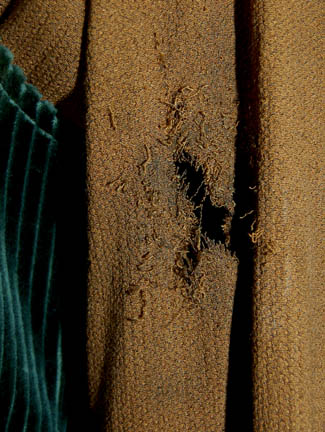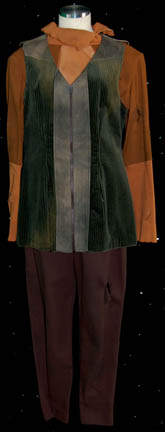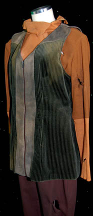 Description: A lot of items for wear in the eighth Star Trek feature film, “First Contact”; wherein the Borg travel back to Earth’s past and try to disrupt first contact with the Vulcans so the Federation will never have been established and the crew of the “Enterprise-E” follow them back to repair whatever damage they have done. This lot consists of two long-sleeved, pumpkin-colored, shirts featuring cuffs and a collar of a lighter colored textured fabric, a mesh-like panel under the collar; one of the shirts is distressed with fraying and minor tears where the other one has a much larger collar. A forest green corduroy vest featuring gray suede accents around the shoulders and down the front and noticeable fading either for effect or from time and storage; three matching brown trousers, one distressed, with stirrups for the feet, two pair of black socks, and weathered, brown leather boots. There is noticeable fading on the vest and slight fading on the cuffs of the shirt.
