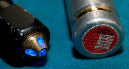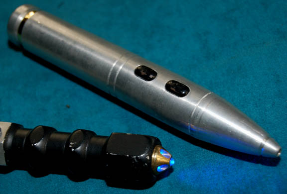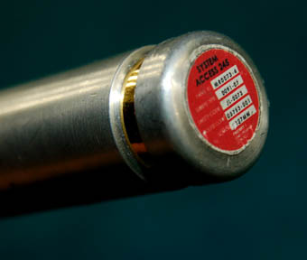 Description: A lot of Star Trek: Enterprise engineering tools. The first metal prop has two black faux buttons, a gold band label and Starfleet label that was featured in an engineering carry case in “The Communicator” episode. The second device is also metal with sections painted black. The gold colored tip has bright blue LED lights that are activated by a switch on the opposite end. Largest item measures approx. 7 ½ x 1 inches diameter.