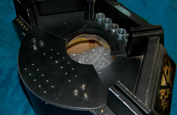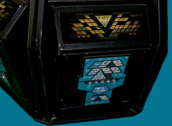 Description: A piece of set dressing featured in the Romulan Interference/ Aenar story arc of the fourth season of Star Trek: Enterprise. This item is part of the circuitry aboard the Romulan Telepresence controlled Drone ship and consists of a black, roughly hexagonal frame that has three identical panels that all feature two predominant parts; the first part is a piece of smoked acrylic with a graphical application of Romulan iconographic symbols adhered to the reverse in the LCARS-style (Library Computer Access Retrieval System), and the second is a rectangular shape that bulges in the middle with similar Romulan symbols painted onto multi-colored symbols and clear, acrylic nodule accents. Screws on the panels grant access to what is beneath them; in the case of the LCARS-style panels, it grants access to the wiring involved with lighting them. The hexagonal frame was only seen on camera from one side so what would be the other three sides is merely a round, wooden panel. The top has a circular hole in the middle where additional circuitry is inserted, several holes for screws and two groups of three fasteners are found behind the circular hole. A standard, three prong, 110-volt plug powers the electronics and measures approx. 27 X 23 X 30 inches.