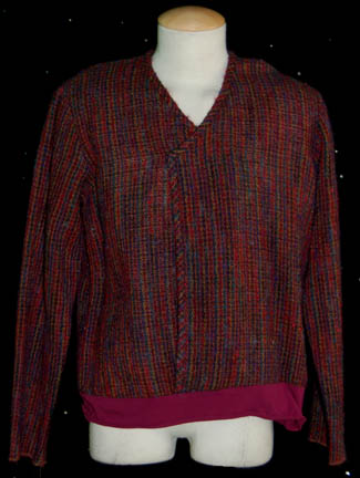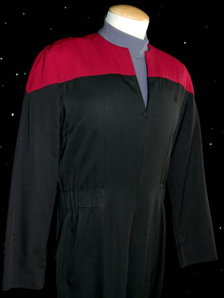 Description: A lot of costumes and costume aspects featured in various episodes of Star Trek: Voyager. This lot consists of two long-sleeved boucle-style jacket featuring multi-colored stripes, a placket front covering up the buttons down the front. A long-sleeved, full-length black, Starfleet uniform jumpsuit featuring Command red division colors around the shoulders, Velcro patch for a commbadge (not included), hoops at the waist for tools, a zip down the front, and a matching long-sleeved, blue-gray undershirt with padding in the chest. Both parts of the Starfleet uniform feature sewn in tags that denote use by Robert Duncan McNeill but the one of the two multi-colored shirts appears to be photo double or a stunt version with the name Brett Jones.