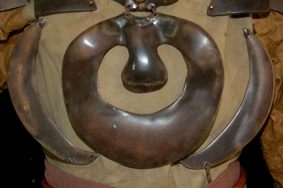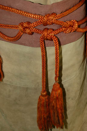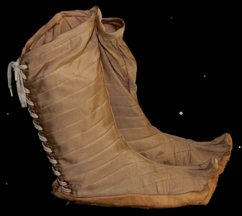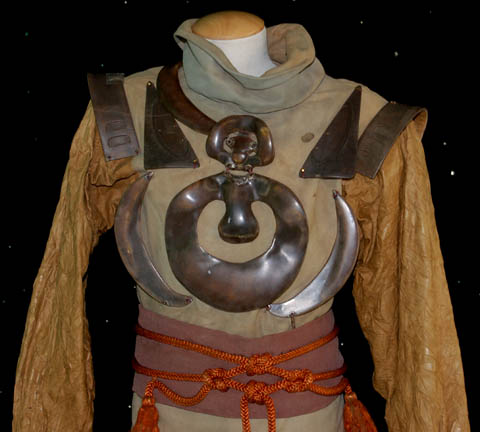 Description: A Federation Security Council alien costume appearing in Star Trek IV: The Voyage Home. The costume is a set of tan boots with upturned toes appearing to have leather soles but with a rubber bottom, matching tan synthetic trousers, a tan suede top with crumple textured sleeves that are pleated for lining, and a wide brown belt with rope tassels. The costume top features a pair of affixed resin shoulder armor scales and a decorative necklace-like element.