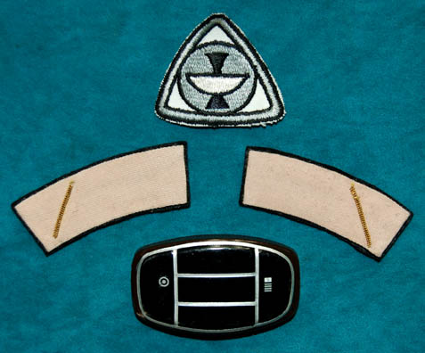 Description: A khaki colored Class-D Starfleet uniform jumpsuit featured in Star Trek I: The Motion Picture. The costume comes with these unattached elements: a command division white backed Epsilon IX assignment patch for the left breast, a bio-monitor, and a pair of white division-rank strips with a thin line of gold colored thread embellishment. The costume is intended for female wearers.
