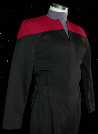 Description: A female Command Red Starfleet uniform made for wear during the Star Trek: Voyager series. The uniform is black with Command red shoulders, a small Velcro patch on the left breast for a Combadge (not included) to attach, a zip up the front and two pleats in the back. Around the waist are loops for away-team gear (not included) to attach. A gray long sleeved undershirt accompanies the jumpsuit. Costume comes complete with costume tag.