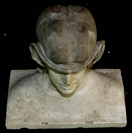 Description: A rubber Ferengi head prosthetic made to create the appearance of a Ferengi during the Star Trek series. It has the characteristic large Ferengi earlobes and forehead ridges. It fits onto the plaster mold bust but is removable. It is more robust than the standard latex prosthetics however it is not painted and therefore was not likely worn on the show. It was presumably made as a study for the latex versions. Due to time and storage the piece is dirty and may need restorative cleaning (not provided). Measures approx. 18 ½ x 10 ½ x 17 ½ inches.