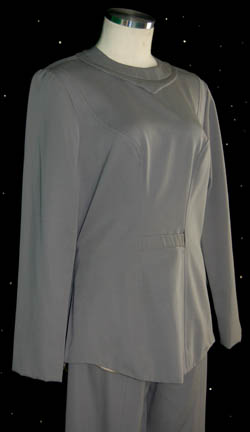 Description: A gray colored Class-A Starfleet uniform featured in Star Trek I: The Motion Picture. The costume is a set of trousers with a matching uniform top that features an unattached bio-monitor and an orange backed sciences division Epsilon IX assignment patch for the left breast. The costume is intended for female wearers.