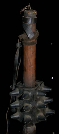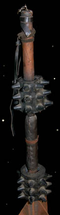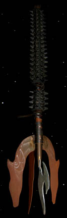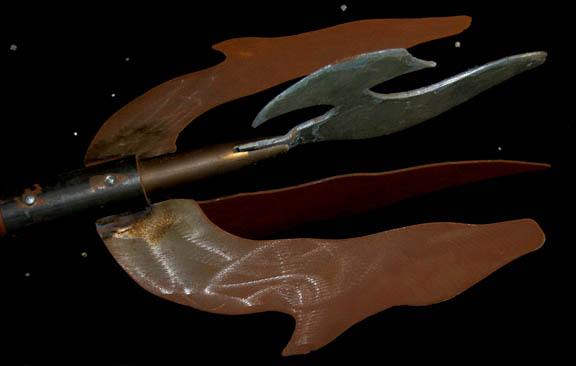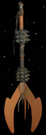 Description: A lot of two prop weapons similar to those featured in the Star Trek: Voyager episode "Hunters"; wherein the Voyager crew comes upon the relay station they used to send messages back to the Alpha Quadrant. The weapon are a staff wrapped in leather strap, black, rubber, spikes on the handle leading to three huge metal blades leading out of the shaft and a smaller foam, blade in the middle that resembles a halberd. The items measure 45 X 16.5 inches.