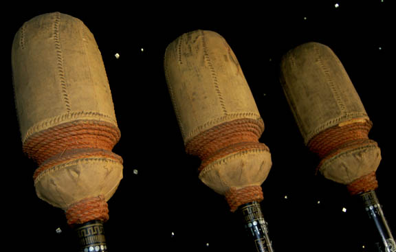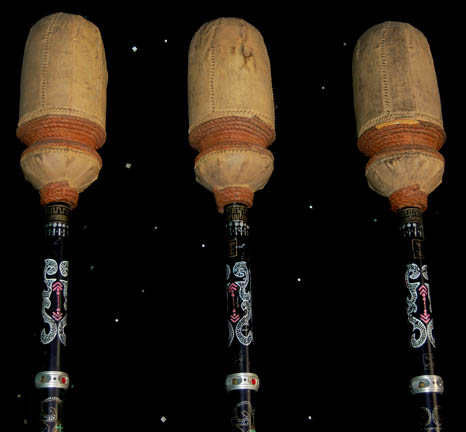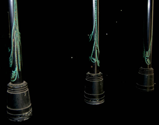 Description: A lot of prop items featured in the Star Trek: The Next Generation episode “The Icarus Factor”; wherein “Commander Riker” (Jonathan Frakes) unexpectedly finds that it is his own estranged father “Kyle Riker” (Mitchell Ryan) that has come aboard to brief him on his new command. This lot consists of three anbo-jytsu staff weapons that “Commander Riker” and his father used in their match against each other; they are black, metal staves featuring numerous Japanese characters and themed designs, a rubber-ended housing for a recessed, “proximity sensor” with untested electronics. A silver-colored ring about ¾ of the way up with a button that is believed to be the switch for the light on the bottom and, on the front end, a half-capsule-shaped padded striking area tied or with orange rope. The item has moderate distress due to time and storage and each one has approx. height of 70 inches and diameter at its largest point of 5 inches.