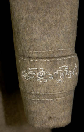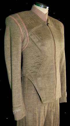 Description: The Vissians are a race encountered by the U.S.S. Enterprise NX-01 in the Star Trek: Enterprise episode “Cogenitor”. Their race includes a third gender called the “Cogenitors” who are treated as objects, being passed around from one Vissian couple to another. This Vissian costume includes a soft faux fur jacket with intricate stitching for detail, tan piping around the shoulders, Vissian designs on the cuffs and a metal button embellishment on the zipper. A sleeveless beige suede shirt is worn underneath with a stitched detail collar. The accompanying trousers are also faux fur with detailed stitching for decoration. Costume comes complete with costume tag that reads “Enterprise, #48, Cogenitor, Vissian”.