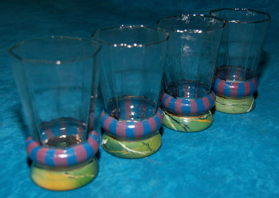 Description: “Quark” (Armin Shimerman) was the beloved Ferengi best known as the owner of “Quark’s Bar and Grill” located on the Promenade of Deep Space 9. These four colorful glasses are from his famous bar and feature an octagonal design with a hand painted multicolored base. Each glass measures approx. 5 x 3 inches diameter.