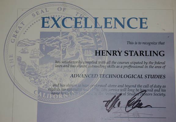 Description: A lot of set dressing featured in the Star Trek: Voyager two-part episode “Time’s End”; where “Voyager” is sent back to the 20th century and finds that they must stop a man from that time from using a 29th century time-travelling ship from going forward into the future and destroying Earth. This lot consists of a college diploma and three commendations received from the state of California; a diploma for a Bachelor’s in Computer Science, a commendation for studies in “Advanced Technological Studies”, a wood plaque with an outline of California carved out of it, from The CA Aerospace Society, and a commendation for completing a course in “Philanthropicoligical Studies”. All items are framed and measure approx. 20 X 13 X 1, 8.5 X 11 X 1, 10 X 8 X 1.5, and 11 X 17 X 1 inches respectively.