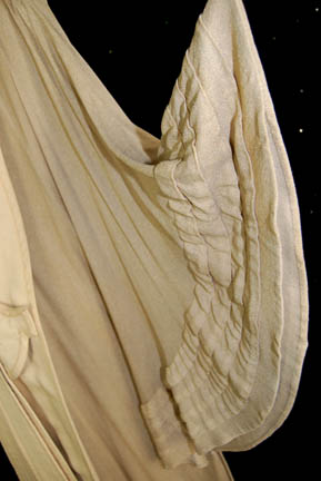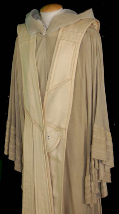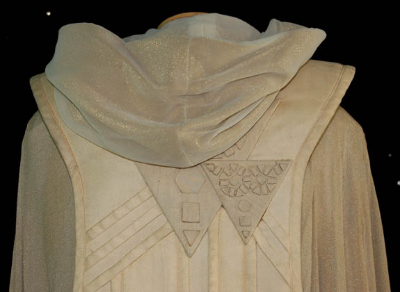 Description: A costume appearing first in Star Trek I: The Motion Picture for wear by the Vulcan Kolinahr master who was to award “Spock” (Leonard Nimoy) a totem of pure logic, and later in the closing scene of Star Trek III: The Search for Spock, possibly for wear by Spock’s mother, “Amanda Grayson”. The costume is a long beige robe with pleated sleeves and a sheer hood worn underneath a thick, cream colored over robe that is adorned with Vulcan mosaic styled leather on the back and bells out toward the ground in two lengths in the front. The over robe is stained near the hem on the reverse due to time and storage conditions and is also very long and acts as a train; numbered and lettered tags are sewn into strategic locations on the costume for the placement of Vulcan badges which are not accompanying. A pair of slippers are present which were located with the costume, they are tan leather, and a single hexagonal gold colored metal bracelet with teal colored ‘gem’s and Vulcan iconographic symbols. Costumer’s tags read ‘Star Trek V, Amanda C1 Scn. 179-185’ and ‘mom off camera Amanda C1’.