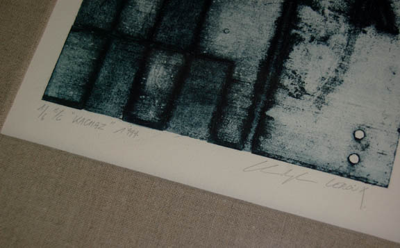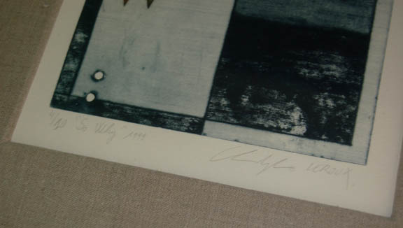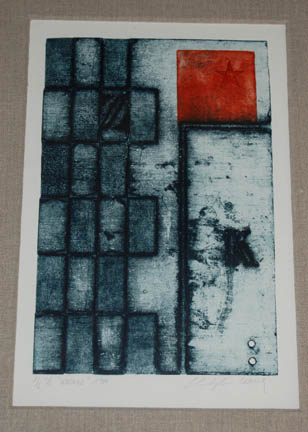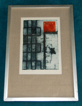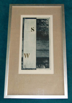 Description: A lot of two pieces of set dressing featured in various episodes of Star Trek: Enterprise. This lot consist of two pieces of art that were to be found in the personal quarters of various crew members of the “Enterprise NX-01”; one framed print features several dark-colored rectangles on an aged medium that resembles linen, a red rectangle in the upper right hand corner with a star in the middle. There is a white outline around the print, a sage-colored background, and a silver-colored faux wood frame with a wire on the back for hanging. The second is in a matching frame and accent and features a vertical off-white section that dominates the left half with a capital “S” and “W” and varying horizontal degrees of blue/black stripes on the right side. The items measure approx. 22 X 15 X 2 and 24 X 14 X 2 inches respectively.