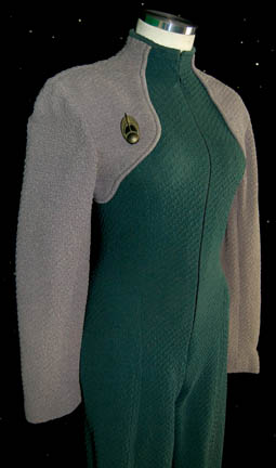 Description: The Bajorans are a humanoid species native to the planet Bajor and were seen throughout the Deep Space Nine series as well as various episodes of Star Trek: The Next Generation and Voyager. This is a female Bajoran worker costume that includes a green puckered jumpsuit with gray sleeves and shoulders. A metal Bajoran badge is attached with Velcro to the right breast. Costume comes complete with costume tag.