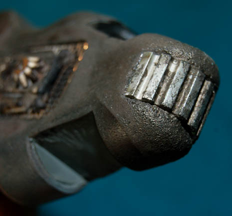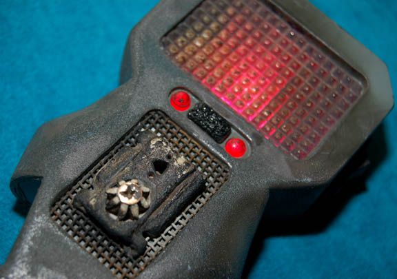 Description: A distressed TNG-style prop medical scanner made for use on the Star Trek: The Next Generation series. The scanner is made of resin painted gray and black to appear burned with metal components added for detail. A small button on the side activates two sequentially flashing red LED lights in the center. When the switch is flipped in the opposite direction the red lights flash and a backlit beveled screen lights at the top. The prop is powered by a standard 9Volt battery (Not included) that is accessed by removing the back panel with a flat tip screwdriver. One of the screws is missing but the back panel stays in place. Measures approx. 5 x 2 ½ x 1 inches.