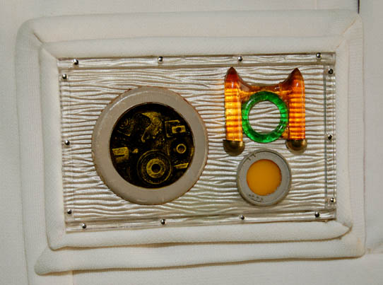 Description: A costume featured in Star Trek II: The Wrath of Khan for wear by “Jedda” (John Vargas), a Regula I researcher who gave his life to protect Project Genesis from “Khan” (Ricardo Montalban). The costume is a brown colored long sleeve shirt with white arrowhead shaped accents on the sleeves, and a white colored asymmetrical front vest with an affixed resin multi-colored accents badge on the chest. The vest features a sewn in Paramount tag reading ‘J. Vargas’.