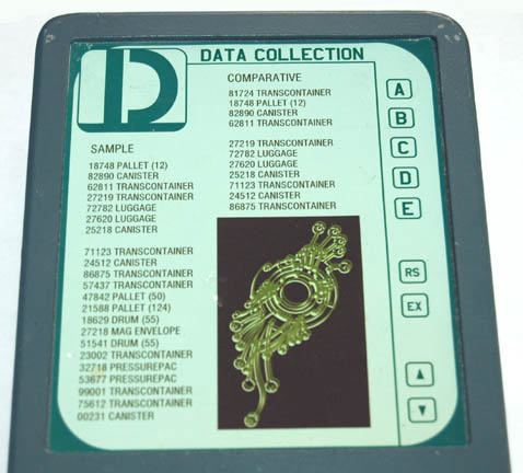 Description: A medium sized PADD (Personal Access Display Device) featured in various episodes of Star Trek: Enterprise like “Horizon”, “Demons”, or “Terra Prime”. The item is painted gray resin with metallic silver adhesive accents, three rubber faux buttons and an inset ‘display screen’ with an application graphic indicating “Data Collection” and features a graphic of a nanoprobe. The item measures approx. 9 X 6 X 1 inches and features a black plastic catch adhered to the reverse presumably for hanging.