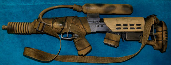 Description: A set of four prop firearms featured in Star Trek X: Nemesis for use by Kolaran raiders. The lot consists of four high quality molded rubber prop firearms, black in color with olive drab colored fabric wrappings. The items are a ‘shotgun’ with a shoulder strap and a banana clip style magazine, a handgun molded to feature a slide action which is in a fixed position, a sub-machine gun with half a banana clip magazine (there is no indication as to whether or not the clip was broken, or cut away purposefully) with an attached gas cylinder, and another sub-machine gun with a bull-pup loading receiver configuration. The largest item measures approx. 29.5 X 9.5 X 3.5 inches while the smallest measures 10 X 6.75 X 3 inches.