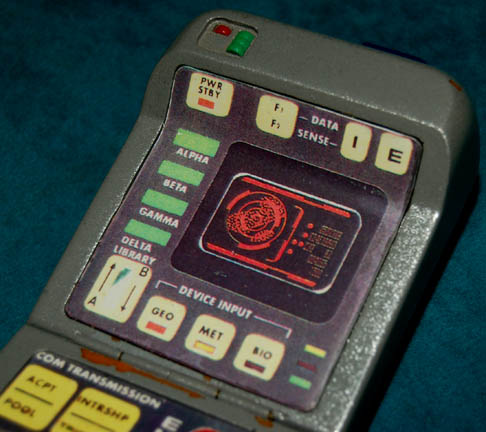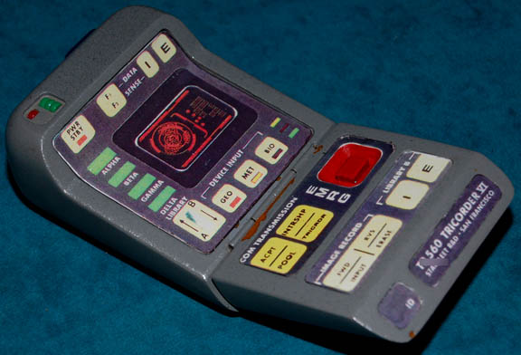 Description: A prop item featured variously in the first two seasons of Star Trek: The Next Generation. This item was the all-purpose engineering, communications, data storage and sensing device for use by Starfleet aboard the Enterprise-D; it is resin cast in silver-gray and flips open, around a hinge on the bottom, to reveal color-printed applications of numerous sensor controls and a central display screen, a red “button” that reads “EMRG” in large letters next to it, a label that reads “TR 560 Tricorder VI” and multi-colored, textured accents on the top, and a space for a detachable hand scanner (not included). The item measures approx. 6.5 X 3.5 X 3 when open.