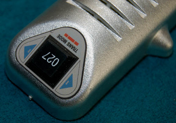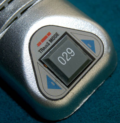 Description: A Universal Translator made for use on the Star Trek: Enterprise, “Demons”. The prop is made of plastic painted silver with labels at the top and bottom. Also attached are two rubber faux buttons. Measures approx. 4 x 2 x 1 inches.