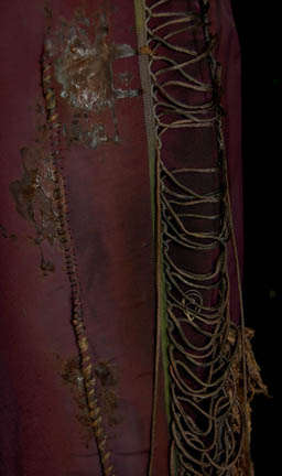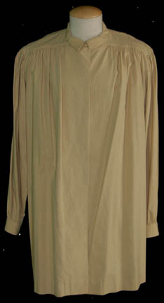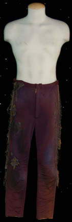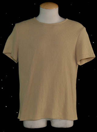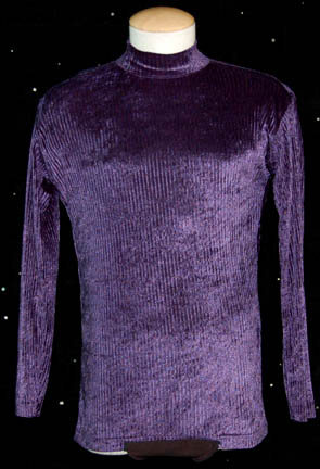 Description: A lot of costume items featured in various episodes throughout Star Trek: Voyager. This lot consists of two white t-shirts believed to be from the episode “Renaissance Man”, one worn by Robert Picardo and one by his stunt/photo double J.R.R Quinonez; a long-sleeved, dark-brown sweater with white and lighter brown spots and faux suede trim, two short-sleeved, beige-colored shirts with textured, vertical stripes, all three from the episode “Life Line” but with both beige shirts for wear as the aforementioned white ones. A long-sleeved, purple shirt with a velvety feel to it, olive-colored, overall-style trousers, stirrups for the feet, and believed to have been featured in the episode “Darkling”. A beige, long-sleeved, smock-like shirt that resembles a similar garment “The Doctor” wears in the episode “Tinker, Tenor, Doctor, Spy” during the daydream where he is drawing “Seven of Nine” (Jeri Ryan); distressed, violet, nylon/spandex-like trousers featuring lacing down the sides, braided, multi-colored fabric on the right leg, and woolen/cotton fringe on the left side. All items are labeled “Robert Picardo”, “J.R.R. Quinonez” or were found in the Robert Picardo section.
