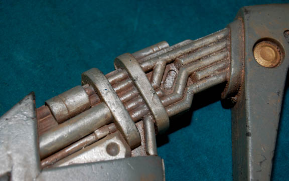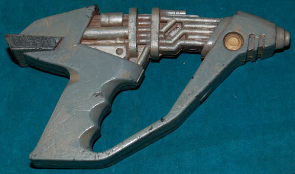 Description: A prop item similar to those featured in various episodes of Star Trek: Deep Space Nine like “Jem’Hadar”. This item is a gray, rubber-cast pistol featuring a molded hand grip, a black, raised accent on the end, silver-colored accents in the middle that emulate the circuitry of the device; an unattached gray, molded plastic accent that goes on the end of the barrel, and a custom made, molded plastic holster with a belt clip. The item measures approx. 10.5 X 6 X 2.5 inches.