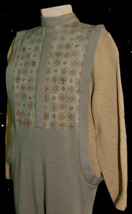 Description: “Ian Troi” (R.J. Williams) was an alien entity who wished to experience being Human in the Star Trek: The Next Generation episode “The Child”. He started his human existence as a fetus inside “Deanna Troi” (Marina Sirtis) and reached full term after thirty-six hours. He reached the age of 8 before sacrificing himself to experience death and to save the crew for the radiation his presence exuded. His jumpsuit has pale olive green legs with tan puckered sleeves and patterned velvet chest and back. Costume comes complete with costume tag that reads, “#127 The Child, R.J. Williams, “Ian”, 8 yr old, #3 outfit, Note different fabric from # 1,2”.