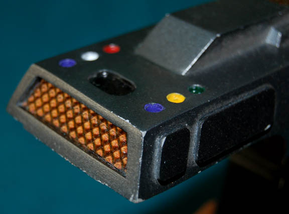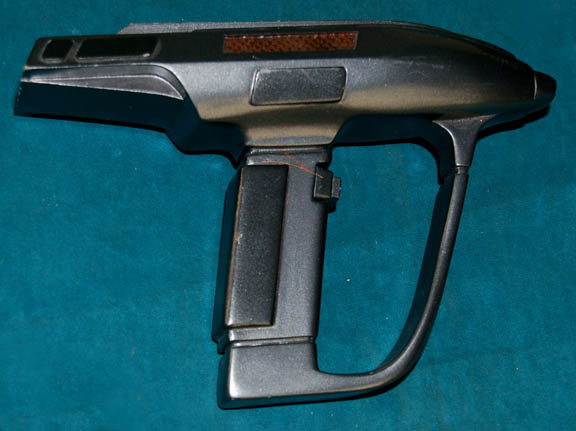 Description: A prop weapon featured in various episodes of Star Trek: The Next Generation that involved Romulans. This weapon was the standard sidearm for the Romulan Military during the 24th century and is a sleek, resin cast dark, metallic-pewter hand weapon with iridescent red accents that appear yellow from another direction, colored “buttons” on the top rear area, darker gray accents around the grip and barrel, an activator “button” where a trigger should be, and a studded, black rubber holster in a lattice design with black fabric threaded between the holes and a Velcro patch around the weapon itself. This particular item is an example of the TNG era Romulan Disruptor that was also used in Deep Space Nine and is one of only a few left that are of such obvious quality. The item measures approx.9 X 6 X 3 inches.