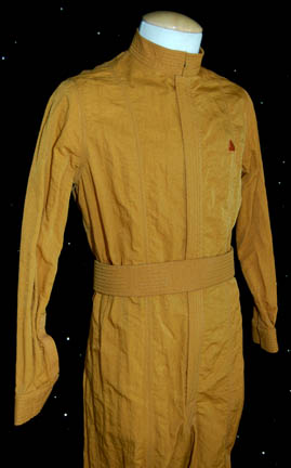 Description: A costume featured in the tenth Star Trek feature film, “Nemesis”; wherein the crew of the “Enterprise-E” travels into the heart of the Romulan Empire, where a political coup has taken place and “Captain Picard” (Patrick Stewart) finds a familiar face planning the destruction of Earth. This costume was used as the photo dbl costume for “B-4” (Brent Spiner); it is a long-sleeved, full-length, mustard yellow Starfleet, engineering jumpsuit featuring lighter yellow-colored stitch accents, a zip all the way down the front, Velcro cuff adjustment, Velcro patch for a commbadge (not included), and a matching belt that attaches via clasps and Velcro. A sewn in tag on the jumpsuit reads Peter Iacangelo, 11-01, B-4, Photo Dbl and a tag on the belt denotes wear by Brian Williams, the accepted stunt person for Brent Spiner.