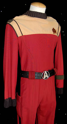 Description: A costume style first appearing in Star Trek II: The Wrath of Kahn and continuing to be in use through the opening sequence of Star Trek: Generations. This costume consists of a long-sleeved, full-length red jumpsuit with tan around the shoulders, black cuff and collar ribbing, dark-green, Security division strips on the shoulders, wider dark-green strips around the wrists, black stripes that follow up the sleeve, along the ribs and down the outside of the leg. Matching faux “pocket” on the right thigh, hoops for a size 28.5, black leather belt with a silver-colored metal, Starfleet symbol, stirrups for the feet, a copper-colored, wire-backed Starfleet insignia pin, an octagonal shaped, wire-backed, metal-colored badge on a red, fabric background denoting the enlisted rank of “Petty Officer First Class”, a silver-colored, gold-trimmed metal pin-backed badge featuring the name “Smalla”, and a pair of black “Puma” athletic shoes with red accents of the Starfleet insignia with wear from time and storage that make them rather fragile.