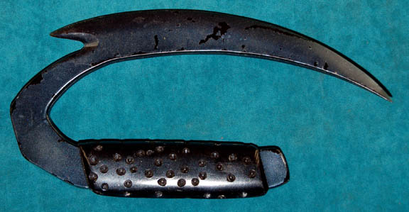 Description: A prop weapon featured in various episode of Star Trek: Voyager involving the Hirogen. This item is dark-gray, molded rubber featuring a curved blade that is oriented parallel to the black, textured handle. The item measures approx. 12 X 6 X 1 inches.