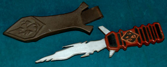 Description: A prop Klingon knife featured in the Star Trek: The Next Generation episode “Firstborn”. The knife presumably came back in time with a future version of “Alexander” (James Sloyan) and depicted the family crest of the ‘House of Duras'. The knife is sturdy molded rubber with a brown and black painted grip and a metallic silver painted ‘blade’ and guards. The item features a molded crest on both sides of the grip depicting the Klingon iconology of the deceased ‘Duras’, “Lursa” (Barbara March), “B’Etor” (Gwynyth Walsh), and her unborn child. The item comes with a brown colored vacuum formed sheath with a belt loop and the crest molded onto the point. In the sheath the item measures approx. 14 X 3.5 X 1.5 inches.