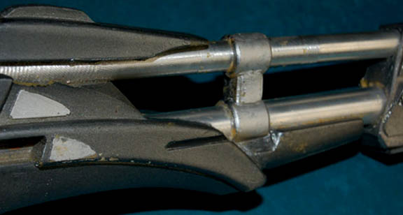 Description: A prop rifle featured in the Star Trek: Deep Space Nine episode “Field of Fire” for use by Nichole de Boer in her portrayal of “Ezri Dax” or “Chu'Lak” (Marty Rackham). In the episode, the item appears as a prototype projectile weapon that was outfitted with a transporter to allow its chemically fired bullets to transport to a location a few centimeters from its target. The item is made from high quality molded rubber painted metallic pewter and silver with silver colored metal accents. A metal hood is present on top of the item and the two gun barrels on the item are silver colored metal. The faux ‘trigger’ button is painted red within the trigger guard. The item measures approx. 40 X 9.25 X 2.5 inches. There is a degree of wear visible where the paint has come away from the item in several places, but overall, this prop retains its excellent qualities and is really quite something to see.