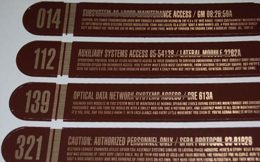 Description: An entire sheet of Starfleet inventory applications like those appearing in Star Trek VIII: First Contact through Star Trek X: Nemesis on board the “USS Enterprise-E”. The sheet is comprised of eight applications, all rust brown colored signage, silk screened onto a metallic gold adhesive label. Each is individually associated a three digit numeric value on the left side with an item title and instructions or a cautionary alert. The alerts are made up of reasonable techno-Babel usually degenerating in to humorous phrases within only a line. One title reads, ‘Calibration Instructions for Model GM 08:26:59A’, one example of the instructions reads as the introduction to vintage Superman cartoons, another is the lyrics to the Brady Bunch opening credits theme. The applications measure approx. 7.25 X 1.25 inches each.