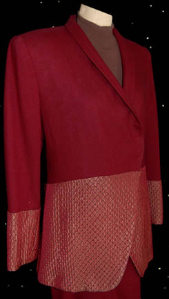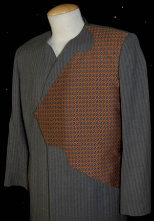 Description: A costume featured in various episodes of Star Trek: Deep Space Nine. This lot includes a suit for a Bajoran man aboard DS9; it consists of a long-sleeved, long jacket featuring a lighter and darker design of vertical gray stripes, hidden snaps down the front, and a copper-colored/gray criss-cross onset on the left side, and matching gray, trousers. The Bajoran women’s costumes consists of a short-sleeved, brown blouse, a long-sleeved, burgundy jacket featuring snaps down the front, and a diamond-shaped, textured inset around the bottom and matching burgundy leggings. A sewn in tag on the men’s costumes reads ‘Deep Space Nine, Len Costanza’, the women’s ‘Deep Space Nine, Kathy Lewis’, and costumer’s tags denote them as either men’s or women’s “Bajoran suits”.