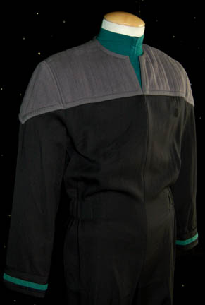 Description: A Star Trek: Deep Space Nine male Sciences Blue Starfleet uniform made for wear during the series. The jumpsuit is black with gray quilted shoulders, blue trim around the cuffs, Away Team gear loops around the waist, a zip up the front and a small Velcro patch on the left breast for a combadge (not included) to attach. Worn underneath is a long sleeved Sciences Blue shirt also with a zip up the front. Costume comes complete with costume tag.