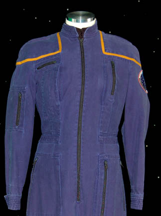 Description: A female Starfleet jumpsuit with Command gold trim around the shoulders made for use during the Star Trek: Enterprise series. It has a famous NX-01 Enterprise patch on the left sleeve, a zip up the front and multiple zippered pockets. There are zips and adjustable Velcro fasteners at the cuffs and ankles. Worn under the jumpsuit is a long sleeved black shirt with buttons up the front. Costume comes complete with costume tag.