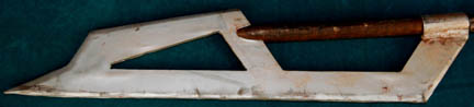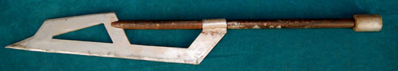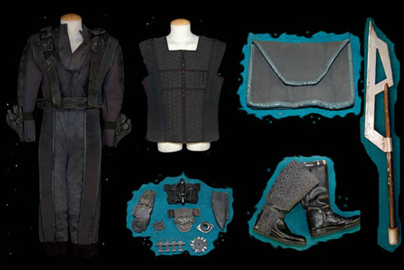 Description: A costume featured in various episodes of Star Trek: Deep Space Nine. This costume consists of a sleeveless, full-length, jumpsuit with the top half a black, spandex-like material, the bottom being neoprene over a gray fabric featuring a starburst pattern down the middle and stirrups for the feet. Also included is a vest of further neoprene under sections of black, lattice textured and wrinkled fabric separated into further sections by oversized black piping, a distressed jacket matching the lower-half of the jumpsuit, faux suede around the collar, fabric, an unattached pocket that is supposed to go on the right leg, a wide belt and bandolier featuring intricate rubber and molded foam accents that have started to dry out due to time and storage; multiple loose costume accessories with rubber, resin, or metal components and some with Velcro placements, and two of the black, molded-rubber, wrist phasers. Knee-high, black, leather boots in a matching motif with the belt/harness and in a corresponding color to the rest of the costume. With this costume comes the Jem’Hadar melee weapon, a prop Kar’takin, it is a short, wooden pole-arm type weapon with a weighted metal-colored end, the blade is molded plastic on a metal frame, is long, vaguely triangular, straight edged to a point and made for stabbing and slashing in battle. Multiple tags denote use by multiple actors and stuntmen and the costumer’s tag denotes it as the “Old Style”. 6145